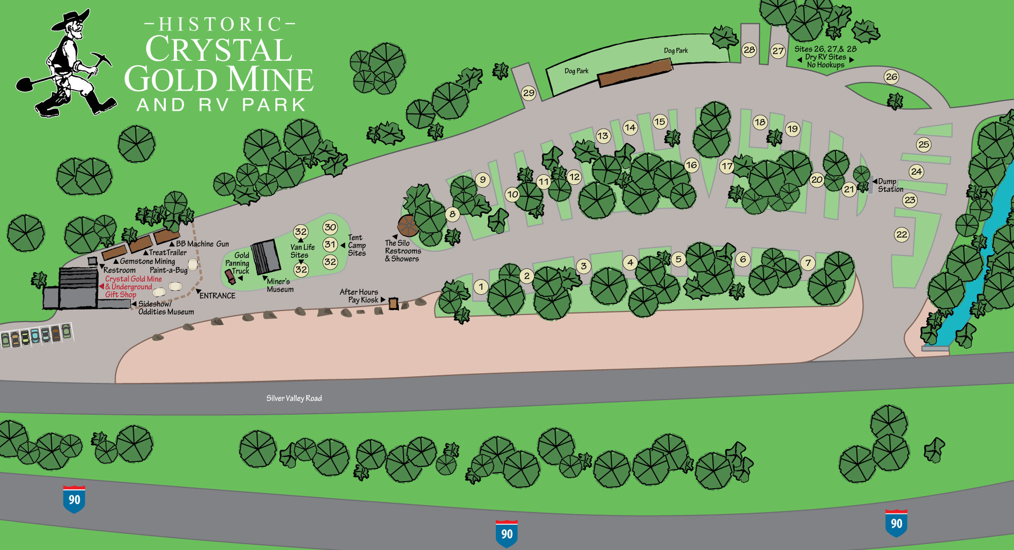 Crystal Gold Mine RV Park in Kellogg, Idaho is right next to the 1800s-authentic, underground goldmine tour, combining historical mining heritage and family camping fun!
